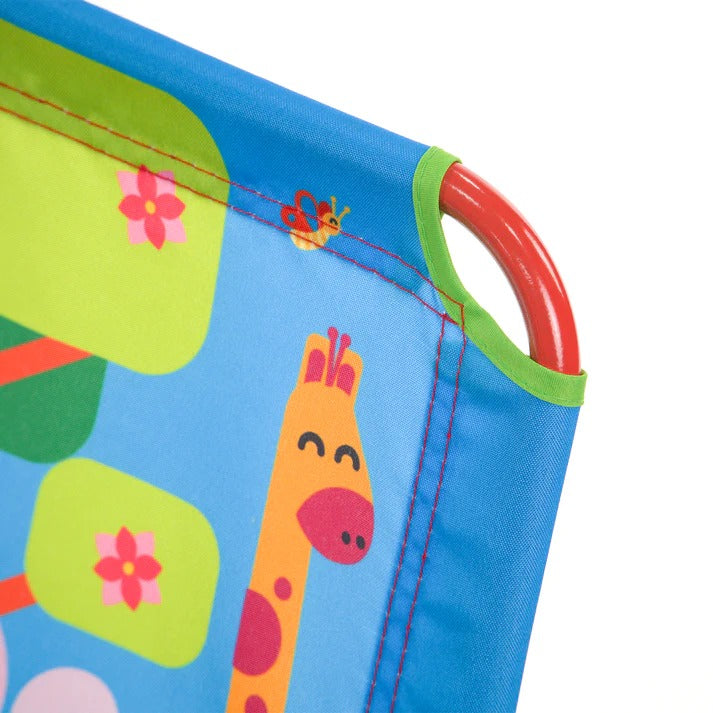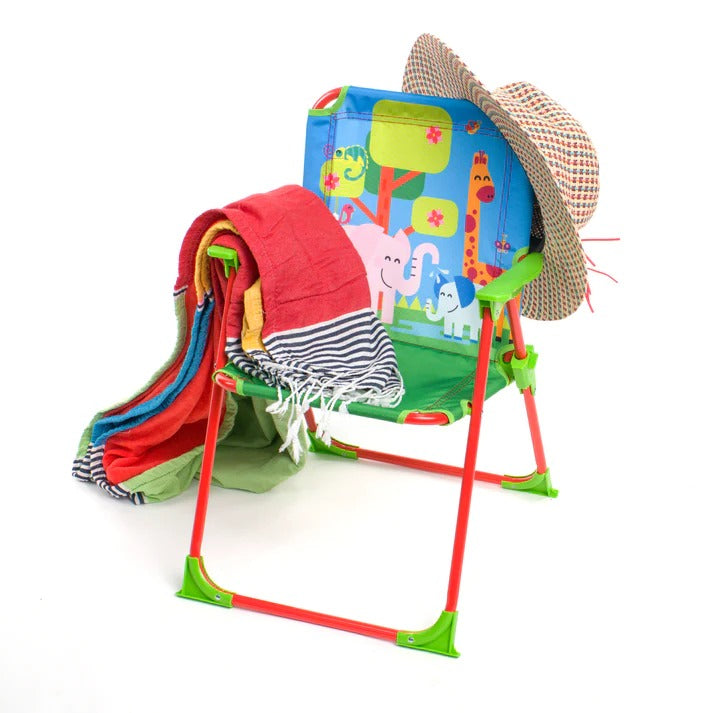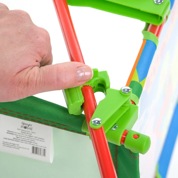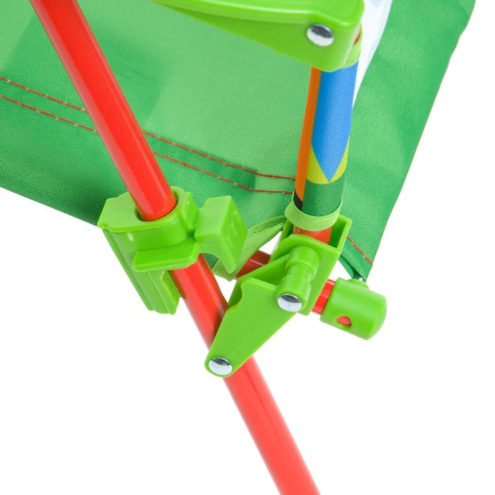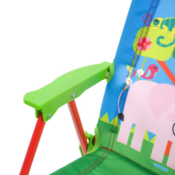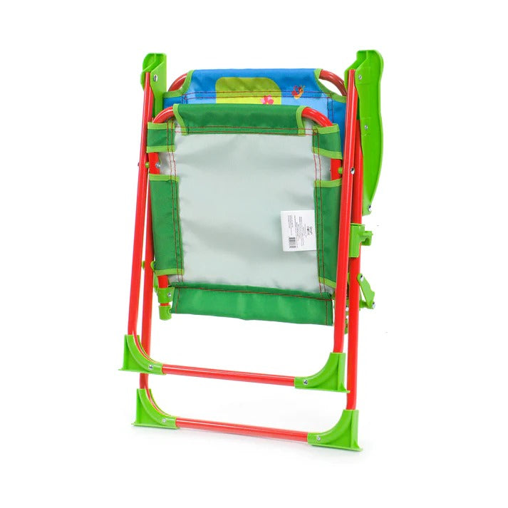 Sklopiva dečija stolica sa čvrstom metalnom konstrukcijom, mekim tekstilnim sedištem i udobnim naslonima za ruke.