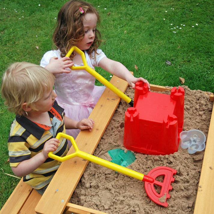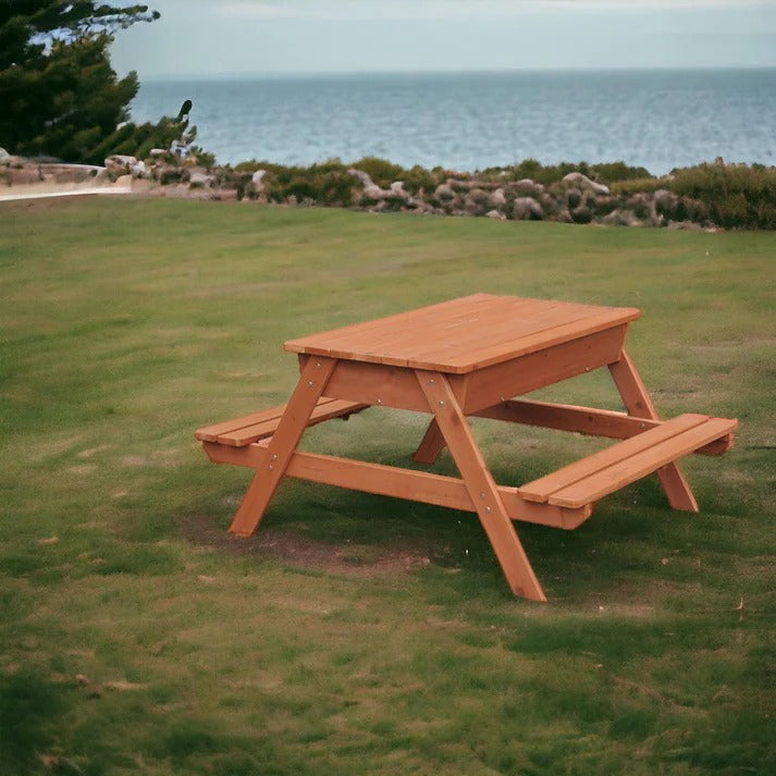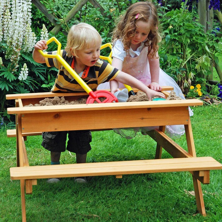 Pretvorite baštu u prostor za igru gde se mališani zabavljaju sa prijateljima u prirodi uz dečiji piknik sto sa pregradom za igračke i pesak.