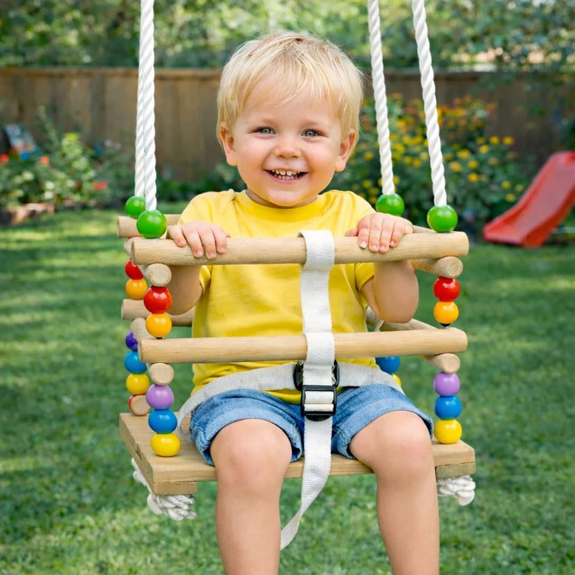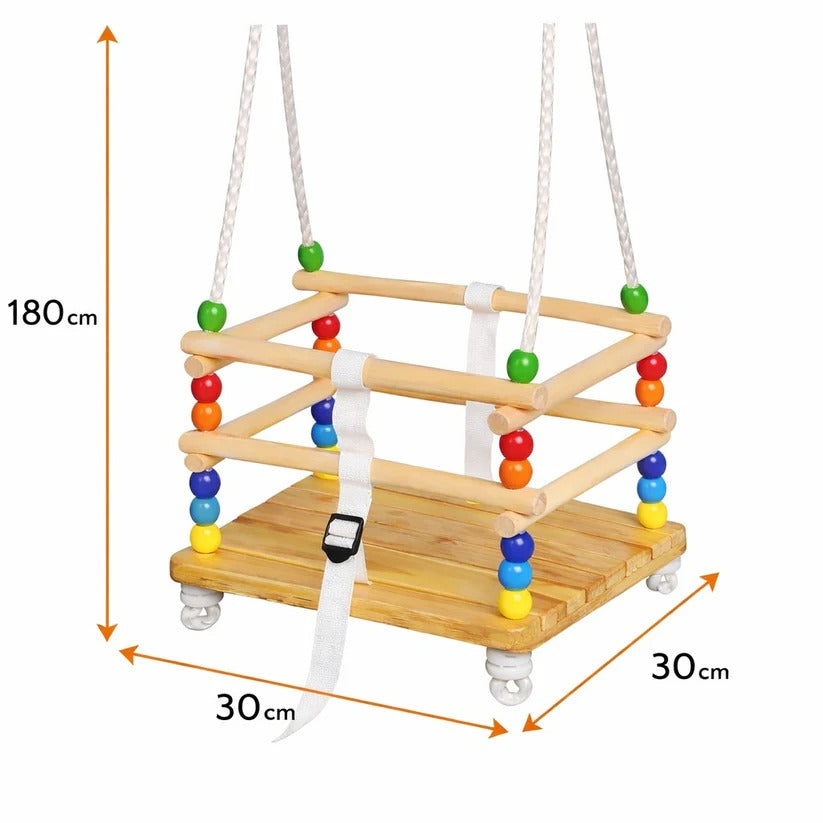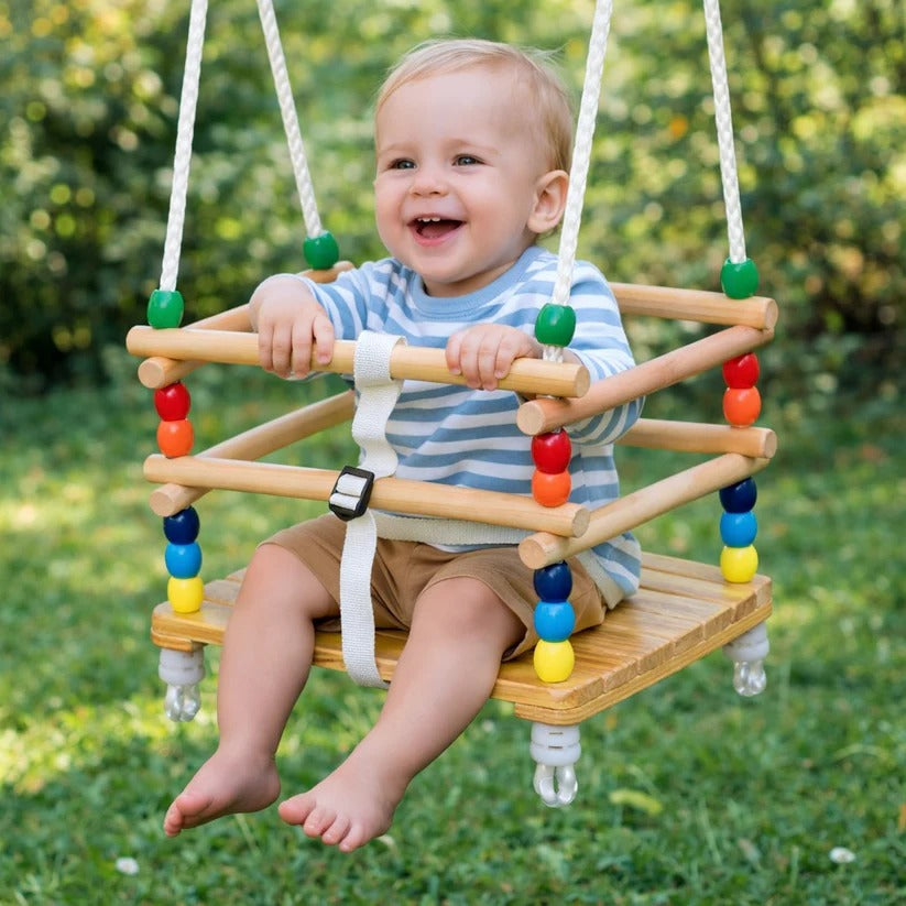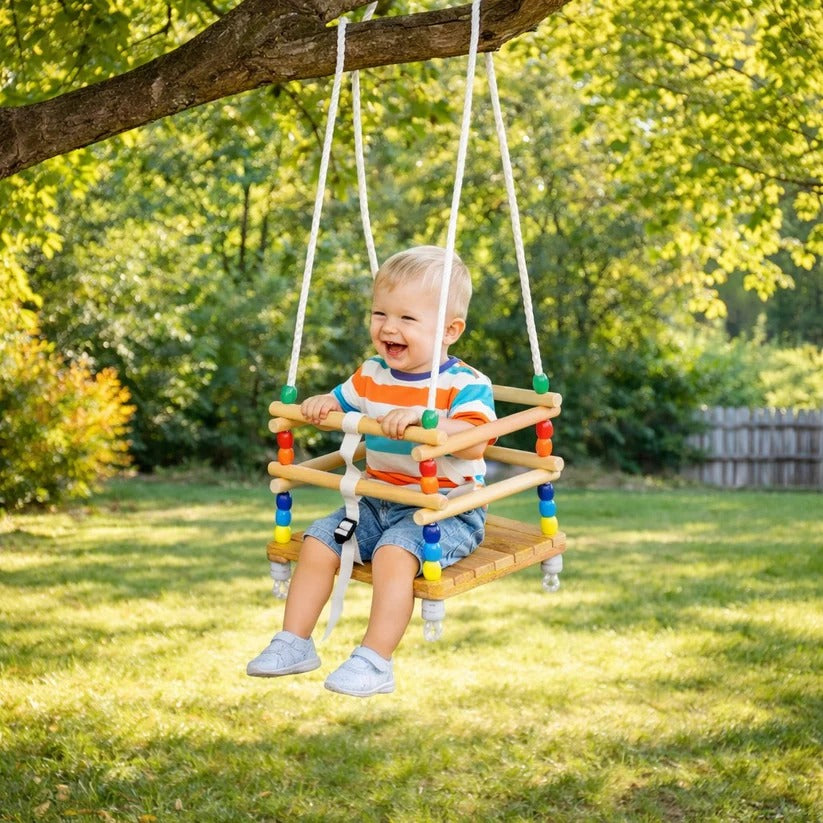 Ljuljaška ima zaštitne drvene daske koje okružuju dete i sprečavaju klizanje, kao i podesivi sigurnosni pojas za stabilan i bezbedan položaj tokom ljuljanja. Jaka užeta pružaju pouzdano suspenziju i stabilnost tokom upotrebe.