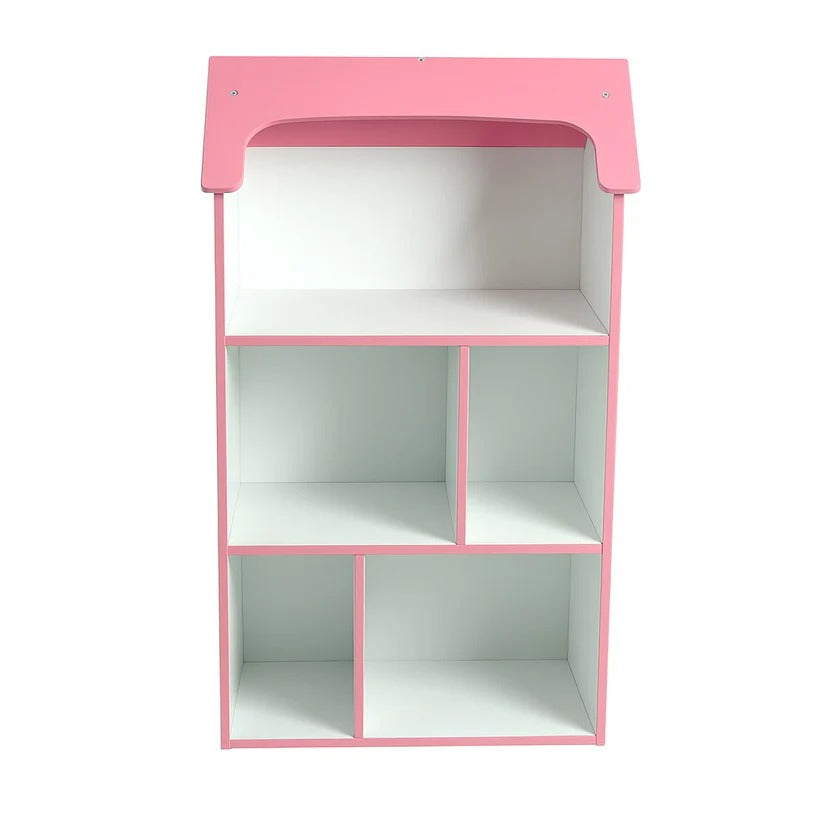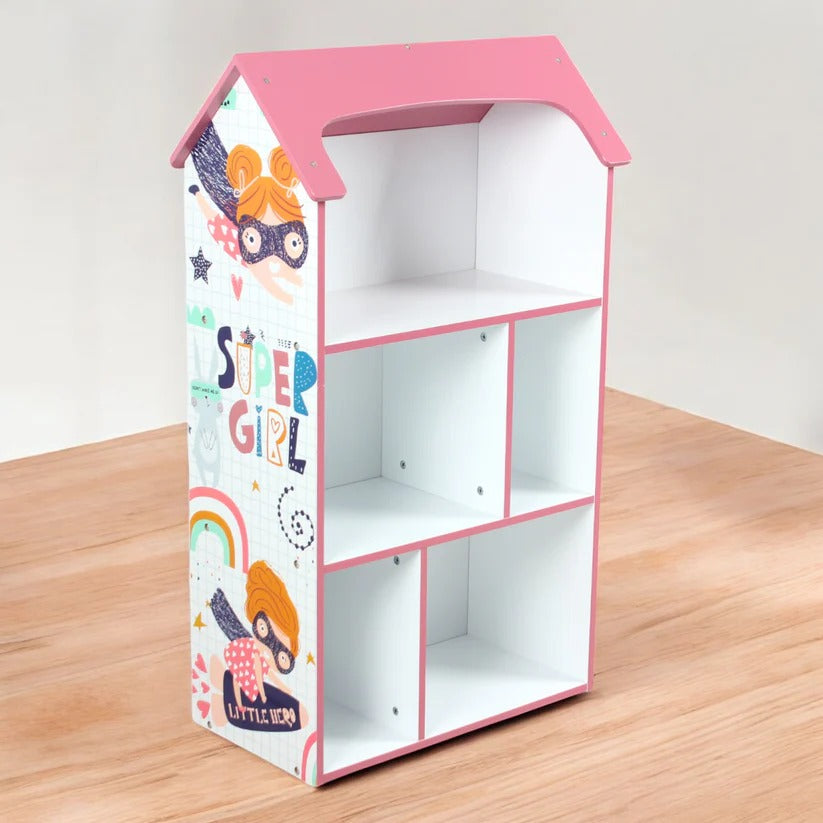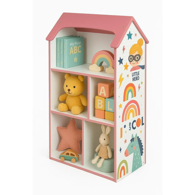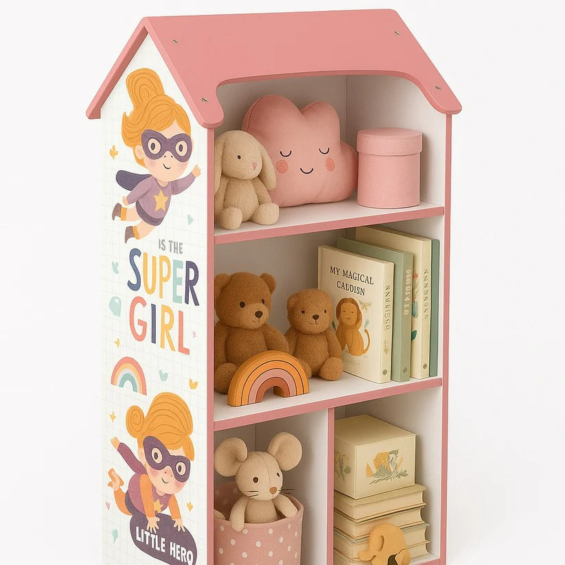 Visoka dečija polica u obliku kuće sa krovom.
