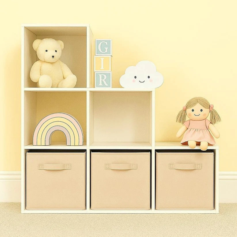 Ima 6 prostranih pregrada pogodnih za dečije knjige, igračke, slagalice, plišane životinje i školski pribor. Uključene 3 bež netkane tekstilne kutije su lagane, bezbedne i jednostavne za upotrebu deci - u potpunosti u skladu sa Montesori principima nezavisnosti .
