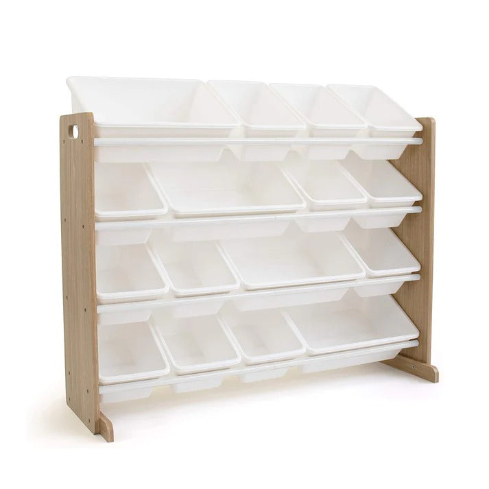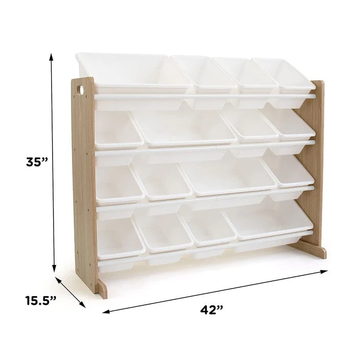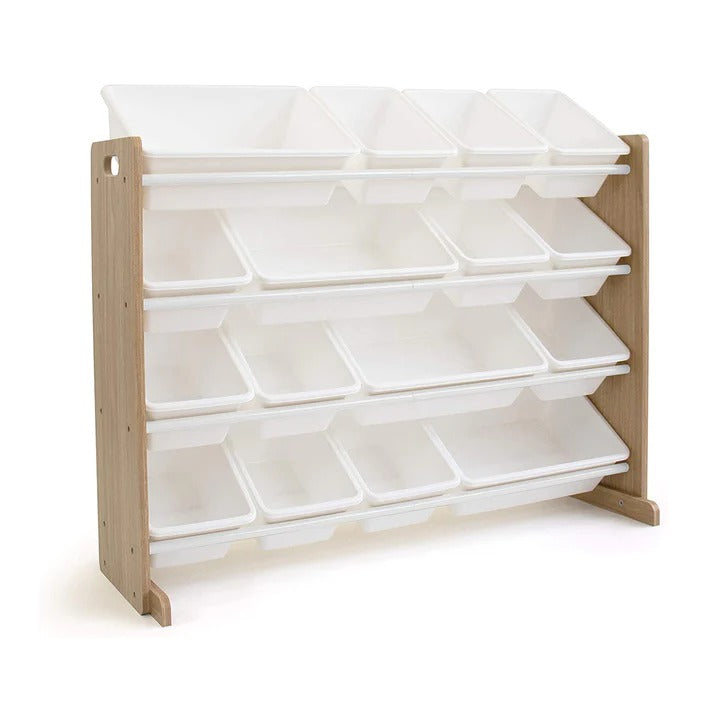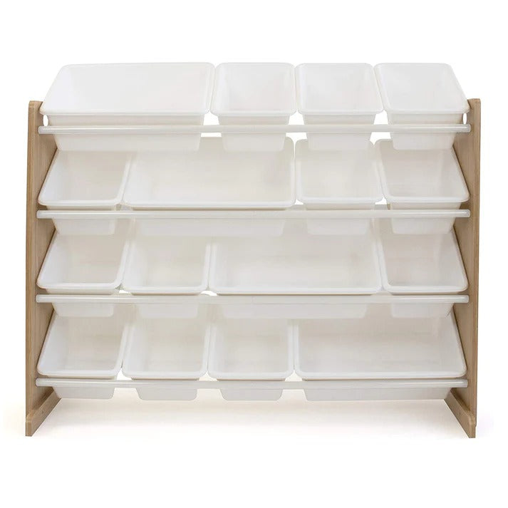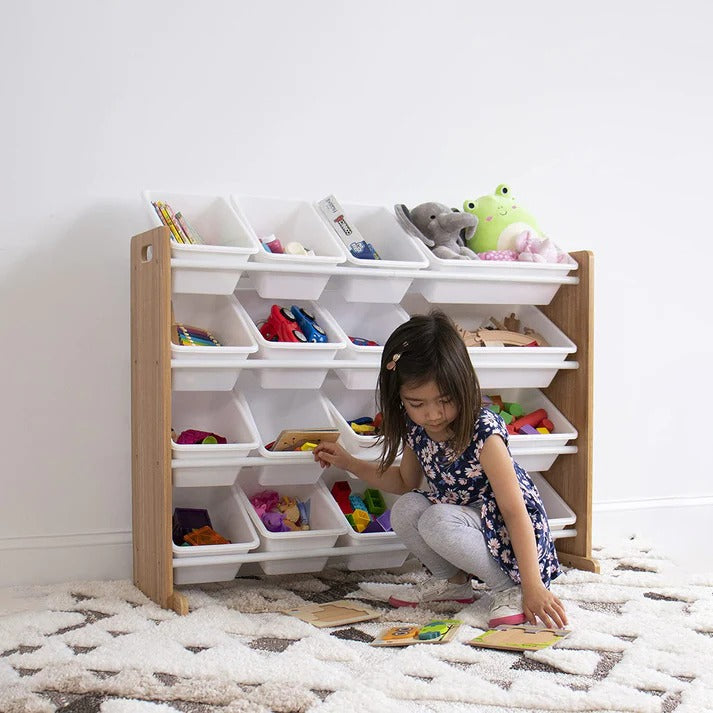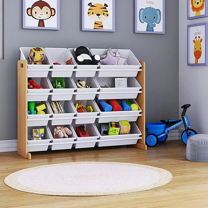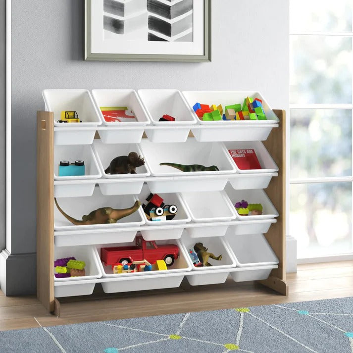 Organizator ima 16 izmenljivih plastičnih kutija za odlaganje različitih veličina - savršenih za knjige, igračke i umetničke potrepštine.