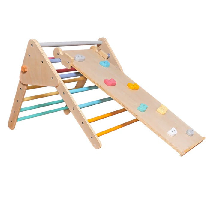 Funkcionalnost 2 u 1: Pikler trougao uključuje dvostranu dasku - glatki klizač na jednoj strani i zid za penjanje sa šarenim držačima na drugoj.